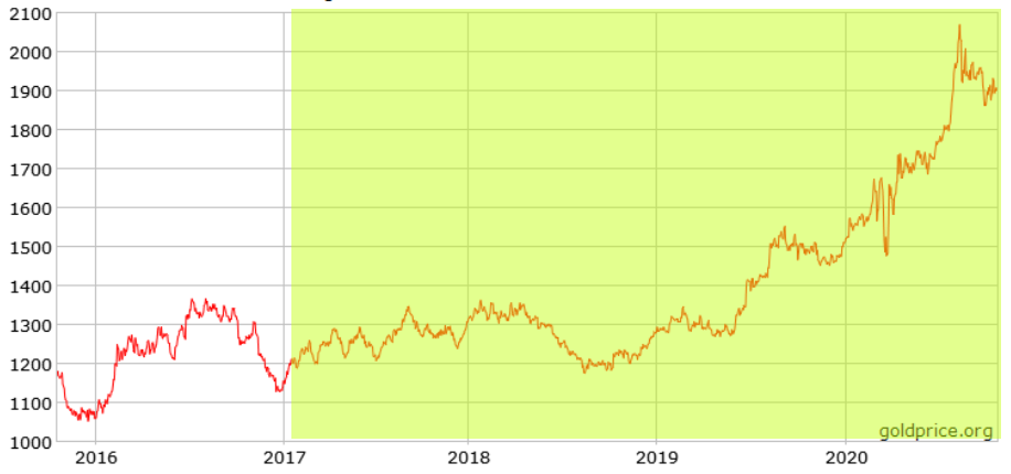 Slika 1: kretanje cijene zlata za vrijeme Trumpovog predsjedništva (zelena boja) u USD po unci, izvor: goldprice.org