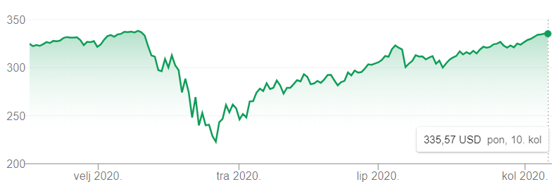 Slika 1: kretanje SPY indeksnog fonda koji prati američko tržište dionica u 2020. godini, izvor: Google.com