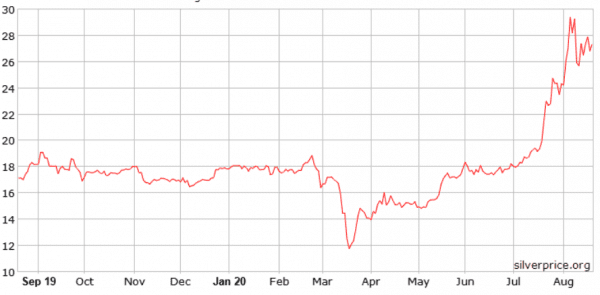 Cijena srebra ove je godine prošla kroz velike promjene. Početkom godine, ona je iznosila 18 dolara po unci, da bi nakon velikog vala prodaje u ožujku cijena pala na 12 dolara po unci. Tu su situaciju mnogi iskoristili za velike kupnje srebra, budući da dugo nije bilo na nižoj razini. Cijena se stoga izrazito brzo oporavila i nastavila rasti te je dosegnula 28 dolara po unci u kolovozu.