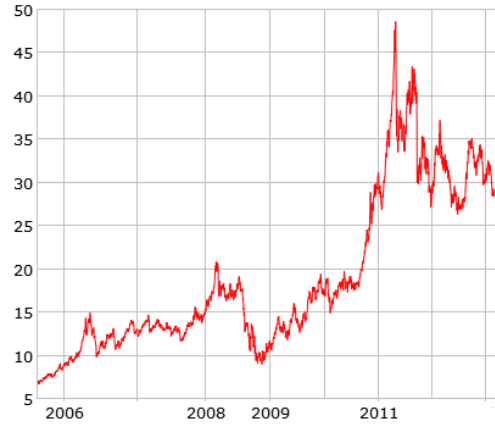 Slika 2: kretanje cijene unce srebra u dolarima od 2008. do 2013., izvor: silverprice.org