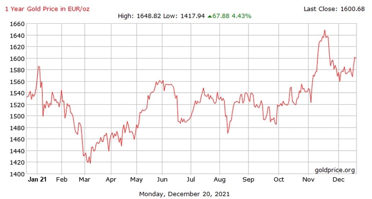 Kako se 2021. približava kraju, sve je izglednije da će cijena zlata, gledano u eurima, ponovo završiti u plusu. Ako bismo gledali godišnje kretanja cijene u američkim dolarima, ono je u blagom minusu, no za nas je važniji euro. Hrvatsko tržište i kuna, ionako su usko vezani za euro čije se uvođenje planira za približno godinu dana (1. siječnja 2023.).