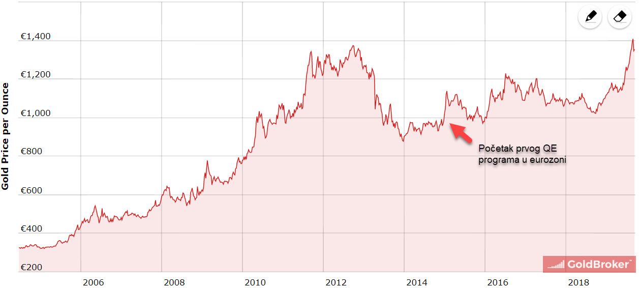 Ako je suditi po kretanju cijene zlata nakon početka prvog programa kvantitativnog popuštanja (QE), cijena zlata će i ovog puta nastaviti rasti. U slučaju da nakon Europe do gospodarskog usporavanja dođe i u SAD-u, trend porasta cijene zlata bi se mogao dodatno ubrzati, na temelju čega će cijena žutog plemenitog metala doegnuti nove rekordne razine.