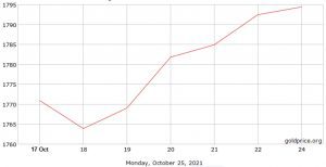 Cijena zlata prošli je tjedan skočila za 25 dolara po unci, na vrhuncu probivši plafon od 1800 dolara po prvi put u posljednjih pet tjedana. Spot cijena zlata rasla je svaki dan od ponedjeljka zaključno s petkom, neovisno o individualnim šok faktorima koji dolaze s američkog tržišta te koji su uzrokovali posljednja dva veća skoka u prethodnih nekoliko tjedana. Zlato je tako postiglo rast od 1,6% na tjednoj bazi.