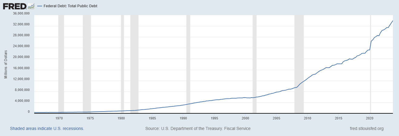 Američki javni dug iznosi približno 34.5 bilijuna (tisuća milijardi) dolara, od čega je gotovo trećina stvorena u zadnje 4 godine. Prema projekcijama Ureda američkog Kongresa za proračun, čak i ako se stopa inflacije spusti na 2%, a Federalne rezerve spuste kamatne stope, fiskalni deficit svejedno će nastaviti izmicati kontroli.