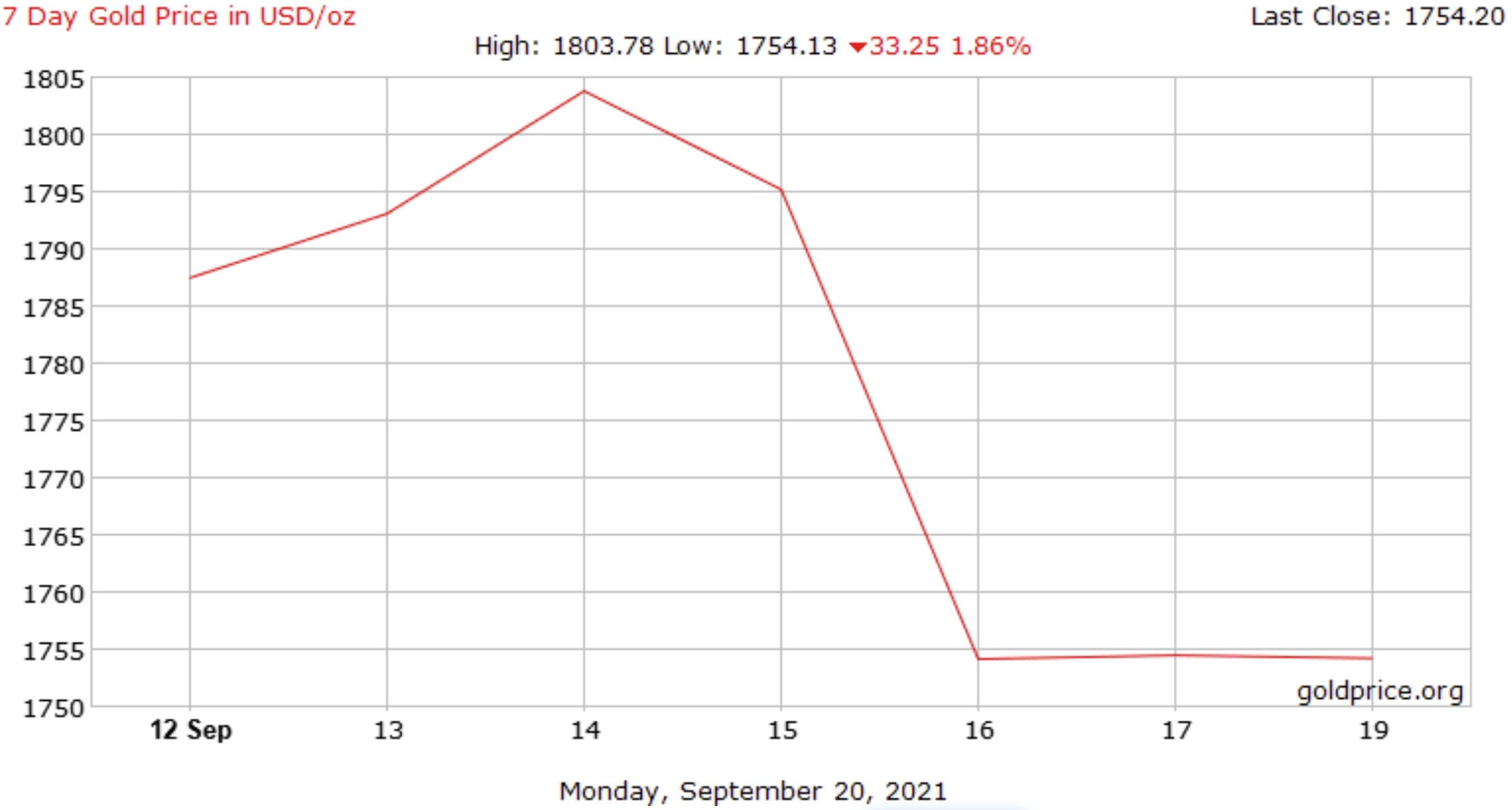 Cijena zlata prošli je tjedan pala na najnižu razinu u proteklih šest mjeseci te se trenutno nalazi na oko 1750 američkih dolara ili oko 1500 eura po unci. Ovaj kratkoročni pad cijene zlata direktna je posljedica jačanja američkog dolara te blagog rasta prinosa na američke desetogodišnje obveznice prošli tjedan.